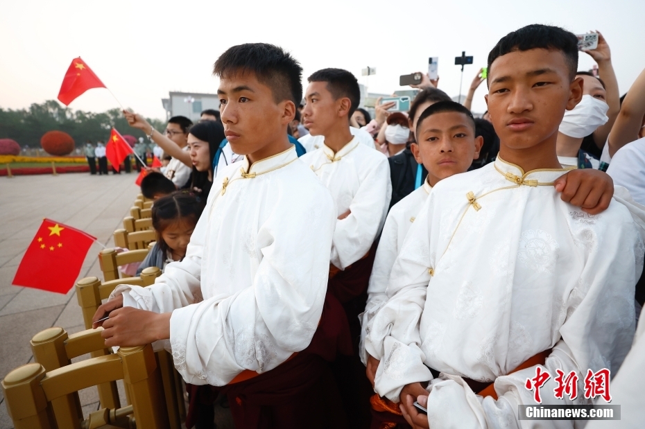圖為觀看升旗儀式的藏族青少年們合影留念。中新社記者 富田 攝
