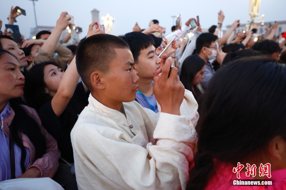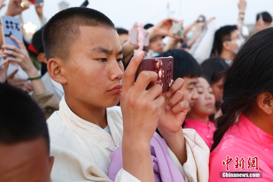 圖為藏族少年用手機記錄升旗儀式的瞬間。中新社記者 富田 攝