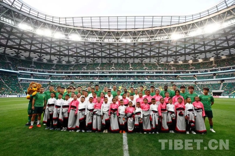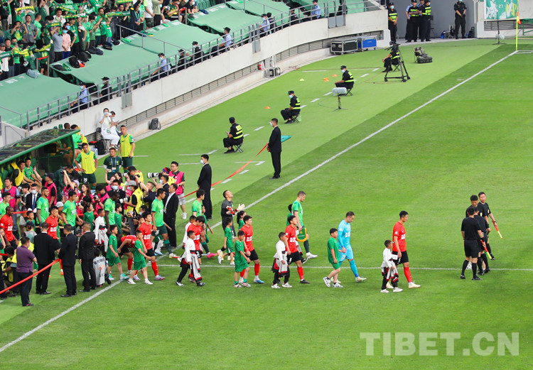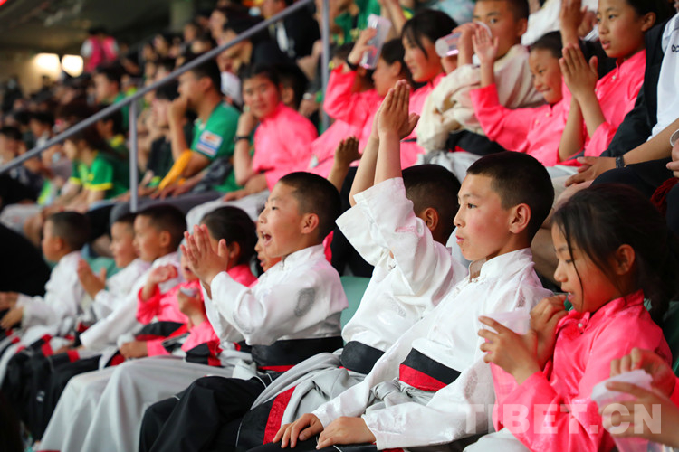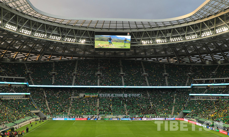 阿斌與5名小伙伴身著藏裝,牽手球員出現(xiàn)在賽場(chǎng)上,頓時(shí)吸引了全場(chǎng)目光。大屏還播放著三江源·北京情·中國心——青海玉樹藏族青少年北京行”的視頻,展示著雪域足球少年的風(fēng)采,環(huán)形LED屏幕用中文、藏文雙語滾動(dòng)播放著40位玉樹少年的名字。