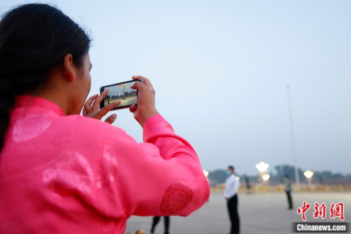 “六一”兒童節(jié)一早,來自青海省玉樹藏族自治州兒童福利院的部分藏族青少年在天安門廣場(chǎng)觀看升旗儀式。圖為鬧增拉毛在拍攝五星紅旗。中新社富田 攝