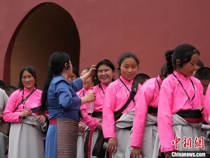 老師白瑪拉毛在給索南拉吉(中)整理頭發(fā)。中新社記者 崔楠 攝