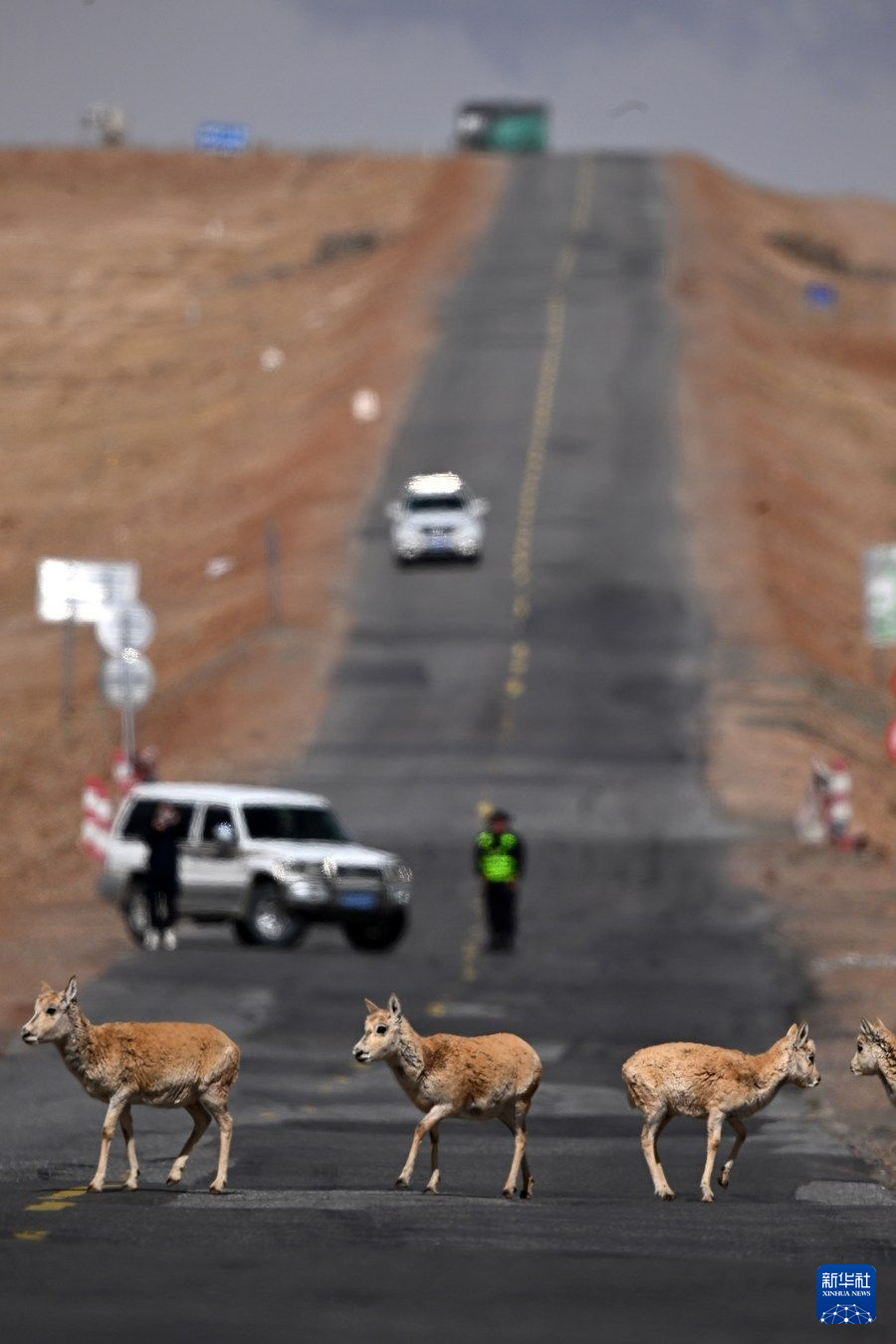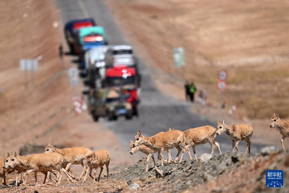 眼下,可可西里藏羚羊進(jìn)入遷徙產(chǎn)仔高峰期,記者近日在青藏公路3001公里處看到,成群的雌性藏羚羊在公路一側(cè)集結(jié),現(xiàn)場的工作人員對往來車輛進(jìn)行臨時交通管制。頭羊反復(fù)試探、確認(rèn)沒有危險后,羊群快速通過公路,向可可西里腹地奔去。