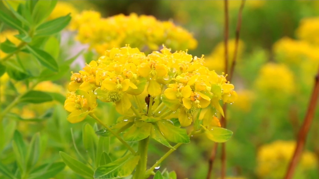 黃色的狼毒花在雨中越發(fā)精神