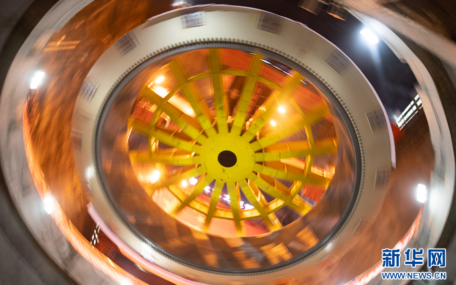 6月30日,瑪爾擋水電站地下廠房內(nèi),工作人員正在進(jìn)行首臺(tái)機(jī)組定子吊裝作業(yè)。新華網(wǎng) 潘彬彬 攝