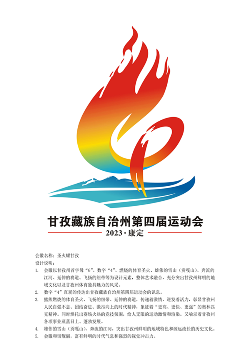 據(jù)王拓進(jìn)介紹,會(huì)徽設(shè)計(jì)靈感來(lái)自網(wǎng)上看到的貢嘎雪山,所以作品以甘孜州首字母“G”、數(shù)字“4”、燃燒的體育圣火、雄偉的雪山(貢嘎山)、奔流的江河、延伸的賽道、飛揚(yáng)的紐帶等為設(shè)計(jì)元素。數(shù)字“4”直觀地傳達(dá)出甘孜州第四屆運(yùn)動(dòng)會(huì)的訊息;雄偉的雪山(貢嘎山)、奔流的江河,突出甘孜州鮮明的地域特色和源遠(yuǎn)流長(zhǎng)的歷史文化;熊熊燃燒的體育圣火、飛揚(yáng)的紐帶、延伸的賽道,傳遞著激情、迸發(fā)著活力,彰顯甘孜州人民自強(qiáng)不息、團(tuán)結(jié)奮進(jìn)、激昂向上的時(shí)代精神,象征著“更高、更快、更強(qiáng)”的奧林匹克精神,同時(shí)烘托出賽場(chǎng)火熱的競(jìng)技氛圍,給人無(wú)限的運(yùn)動(dòng)激情和渲染,又喻示著甘孜州各項(xiàng)事業(yè)蒸蒸日上、蓬勃發(fā)展。