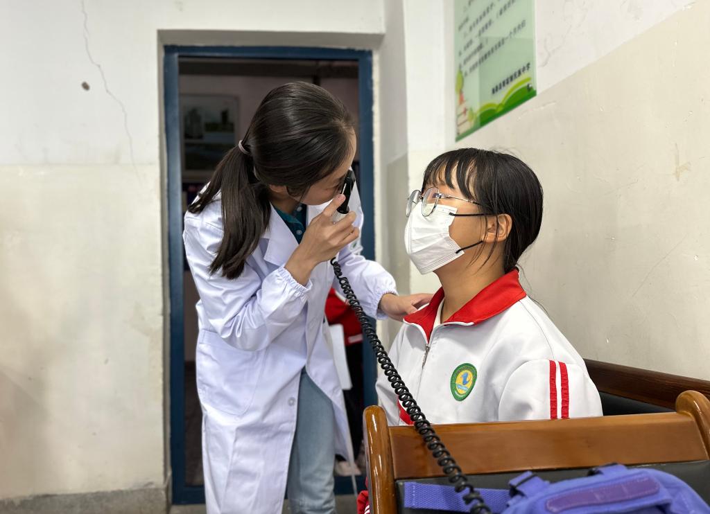 7月7日,在青海省海北藏族自治州海晏縣寄宿制民族中學(xué),北京協(xié)和醫(yī)院醫(yī)生在為學(xué)生做檢查。新華社記者 張子琪 攝