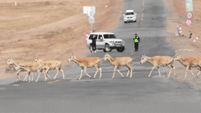 而在青藏公路這頭,可可西里管理處安排工作人員采取短暫交通管制、禁止鳴笛、巡護救助等措施,為藏羚羊遷徙產(chǎn)仔保駕護航。伴隨遷徙高峰期的到來,藏羚羊“過公路”已經(jīng)成為青藏公路沿線的一道獨特風(fēng)景。
