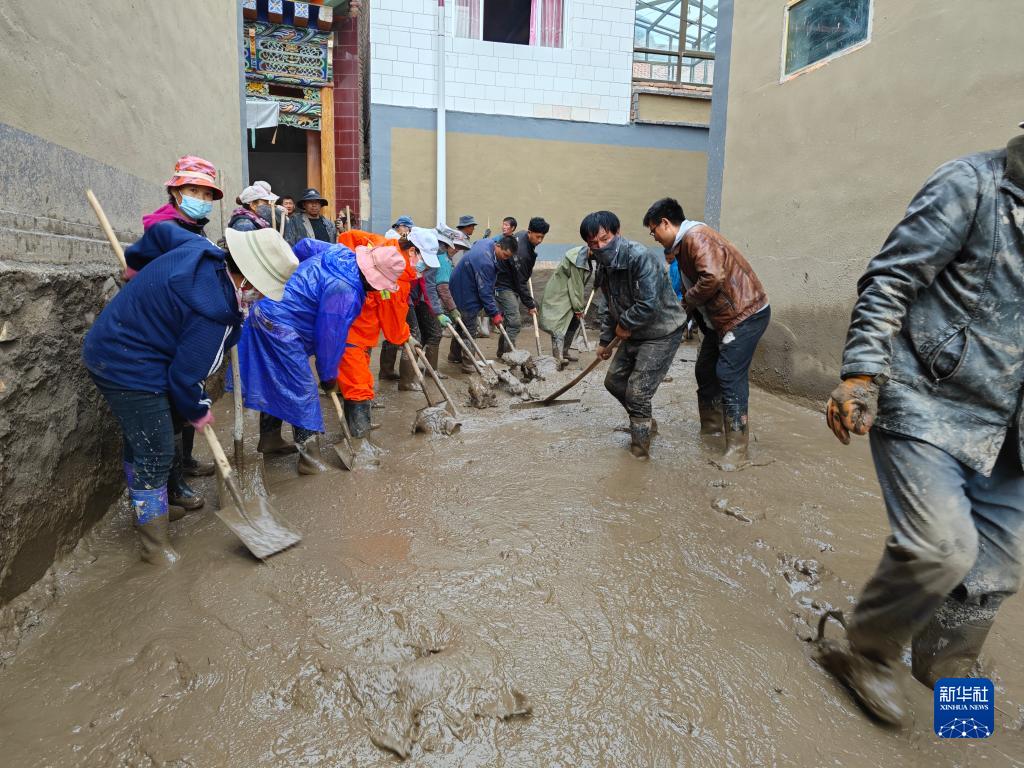 7月11日,在甘肅省甘南藏族自治州夏河縣麻當鎮(zhèn),當地組織力量進行清淤。新華社發(fā)(甘南州委宣傳部供圖)