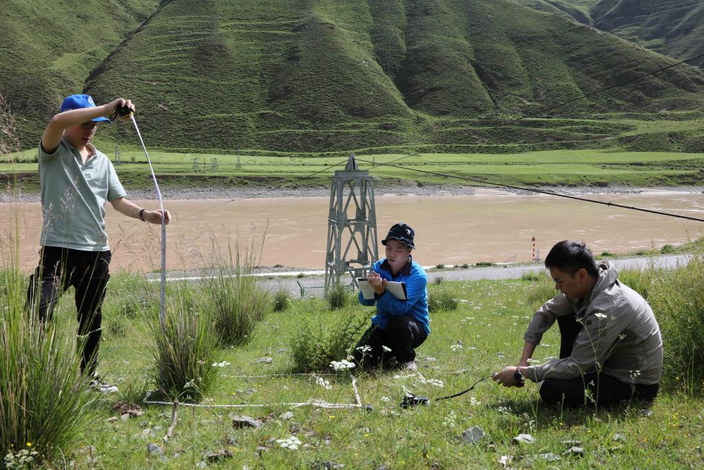 7月22日,長江科學院水土保持研究所的科考隊員在通天河直門達河段進行植被樣方調(diào)查。新華社記者 劉詩平 攝