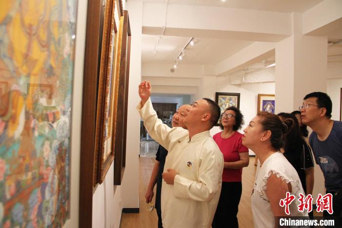 近日,當(dāng)代熱貢唐卡最具影響力人物之一桑杰本的系列作品《十二生肖》在遼寧省沈陽市九方禾谷藝術(shù)館進(jìn)行東北首展,其兒子、徒弟關(guān)卻諾日在現(xiàn)場為觀眾帶來講解。沈陽市九方禾谷藝術(shù)館 供圖。