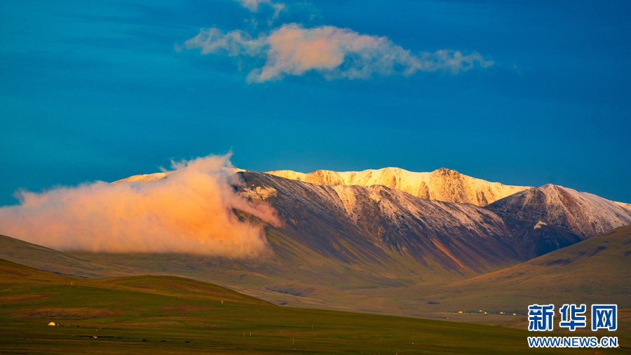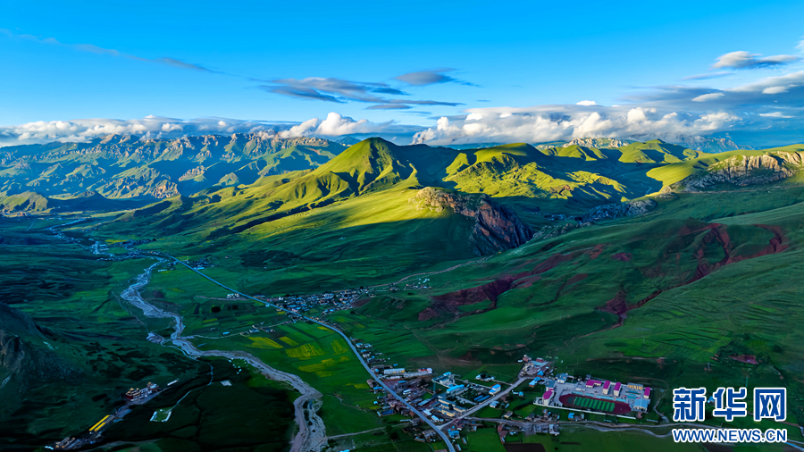 時(shí)值盛夏,青海省玉樹藏族自治州景色怡人,群山和草原在藍(lán)天白云的映襯下構(gòu)成壯美的畫卷。