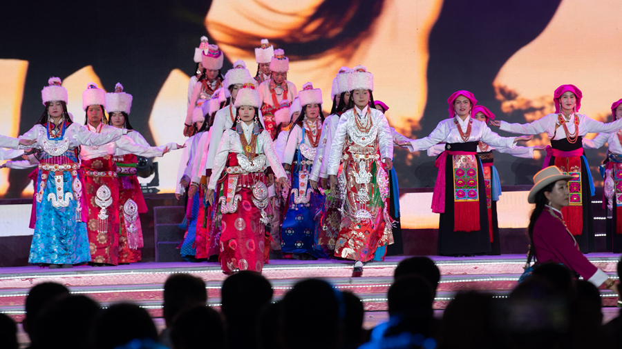 演出現(xiàn)場,燈光秀、曲藝表演、民族歌舞、服飾展演、情景朗誦等綜合藝術(shù)形式輪番上演,為現(xiàn)場觀眾獻上了一場精彩的視聽盛宴。其中,海南州藏族服飾藝術(shù)嘉年華是當?shù)刈罹哂绊懥Φ拿褡逦幕放?,也是當?shù)厝罕娚钪械乃囆g(shù)盛會?;顒訉鹘y(tǒng)藏族服飾品牌與創(chuàng)新服飾時尚品牌融為一體,通過藏族傳統(tǒng)服飾和現(xiàn)代服飾展演,充分展示了海南州豐富多彩的藏族服飾文化魅力。