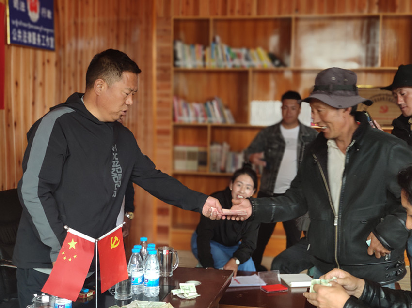 “振業(yè)振興新征程 旺達(dá)村分紅大會”的橫幅在村活動中心會議室內(nèi)鮮艷顯眼,村民們興高采烈,早早地等候在這里領(lǐng)取分紅金?!敖衲炅鬓D(zhuǎn)費(fèi)總計(jì)130000元,每戶可分紅5200元。”分紅儀式上,上木拉黨委書記格絨次乃向村民們介紹了旺達(dá)村房屋流轉(zhuǎn)、荒地收益情況和民宿產(chǎn)業(yè)下一步規(guī)劃。在場村民臉上無不洋溢著幸福的笑容,高興地鼓起了掌。