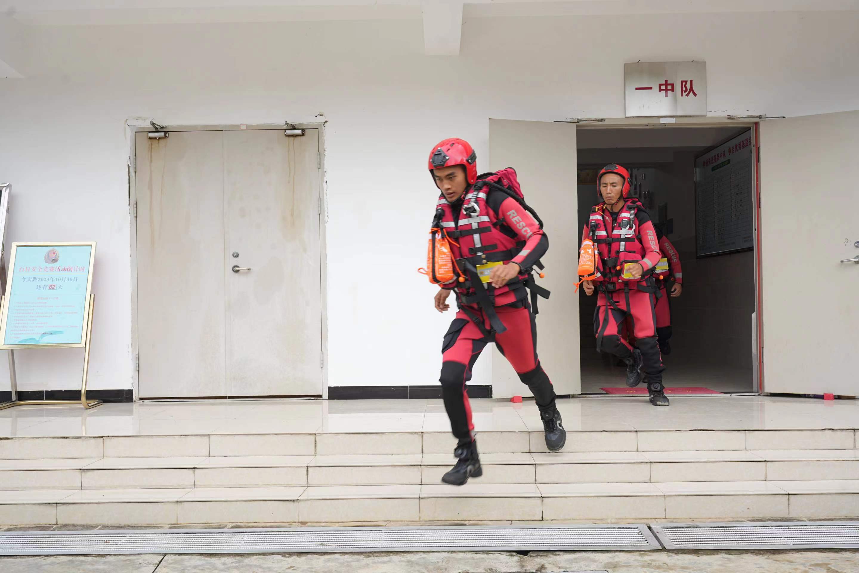 隨著警報聲響起,參戰(zhàn)隊員迅速更換戰(zhàn)斗著裝,攜帶戰(zhàn)斗裝具集結(jié)。到達模擬任務(wù)區(qū)域后,隊伍針對現(xiàn)場實際情況制定救援計劃,奔赴救援現(xiàn)場開展救援行動。圖為演練現(xiàn)場。