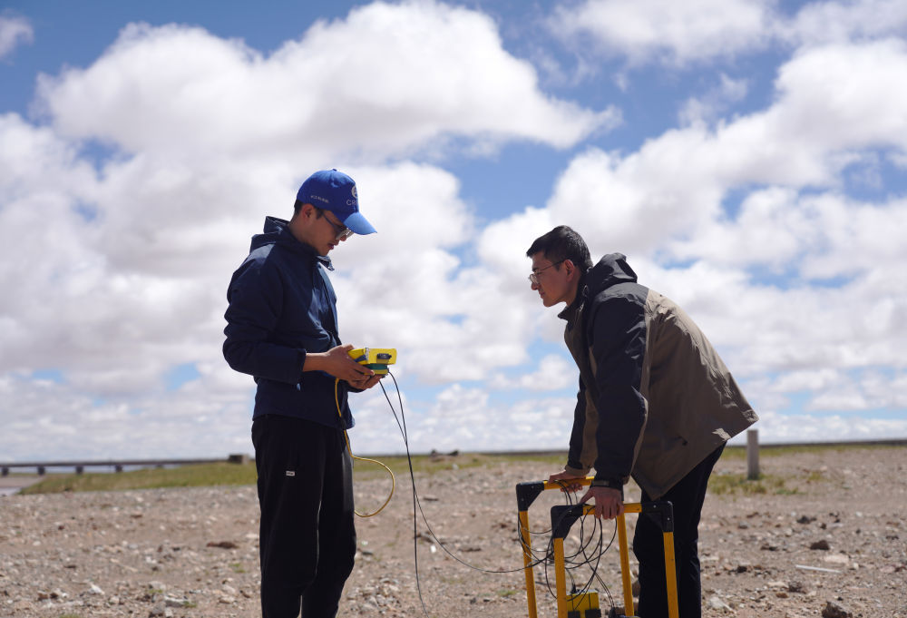科考隊員董士琦(左)和范越在長江北源楚瑪爾河附近進行地質(zhì)雷達探測(7月29日攝)。新華社記者 陳杰 攝