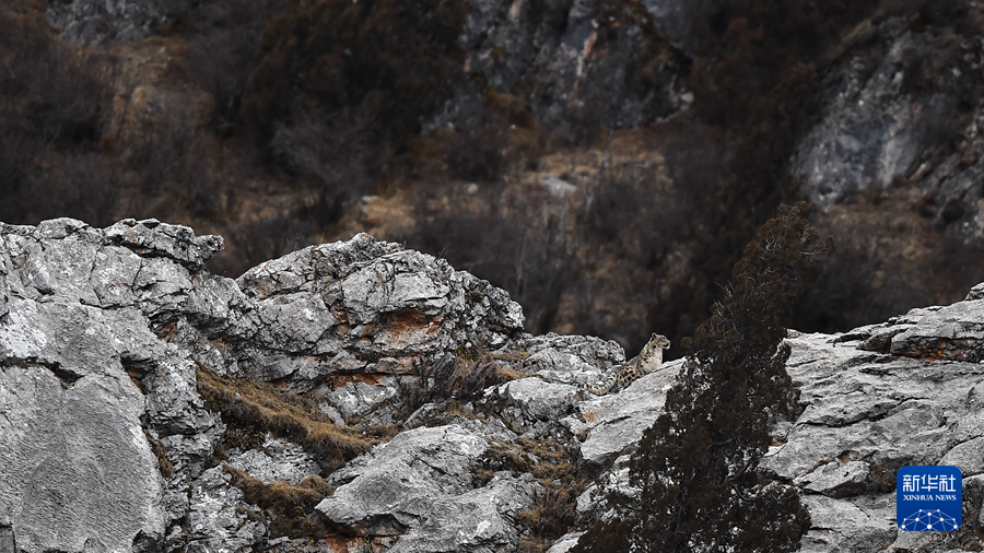 一只雪豹在位于三江源國(guó)家公園瀾滄江源園區(qū)內(nèi)的青海省玉樹藏族自治州雜多縣昂賽大峽谷內(nèi)休息(2023年2月21日攝)。新華社記者 張宏祥 攝
