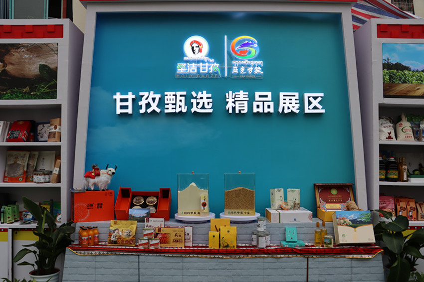 甘孜州各縣(市)的農(nóng)特產(chǎn)品吸引現(xiàn)場(chǎng)不少嘉賓、群眾紛紛圍觀搶購。