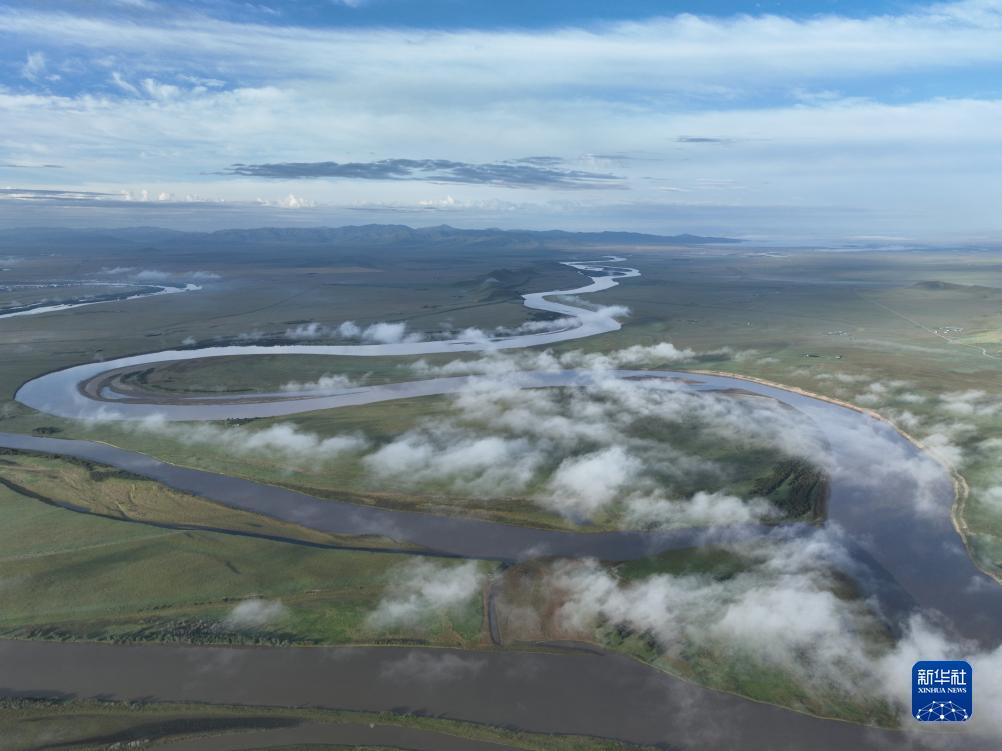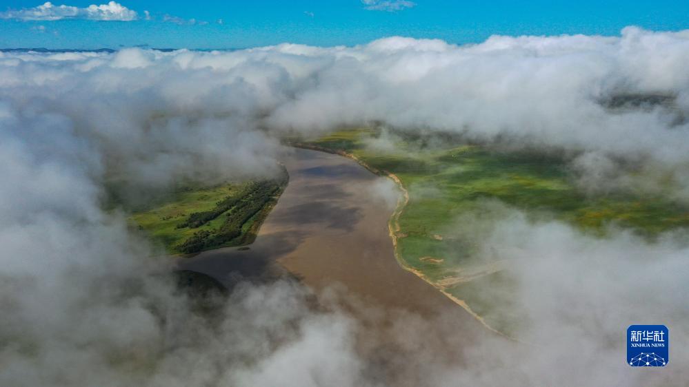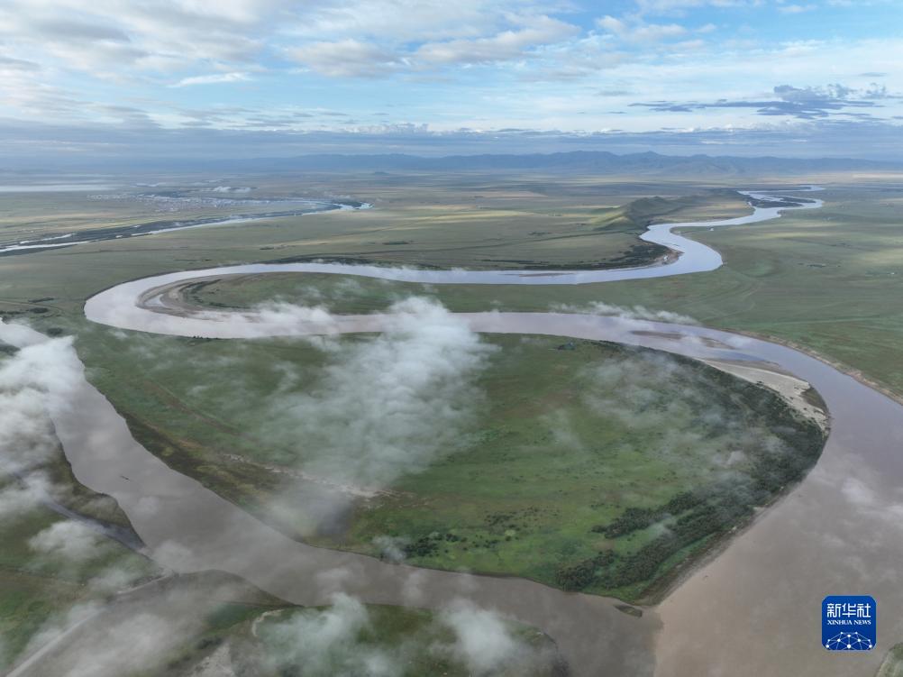 這是8月22日清晨在四川省阿壩藏族羌族自治州若爾蓋縣唐克鎮(zhèn)拍攝的黃河九曲第一灣景色(無人機(jī)照片)。新華社記者 王曦 攝