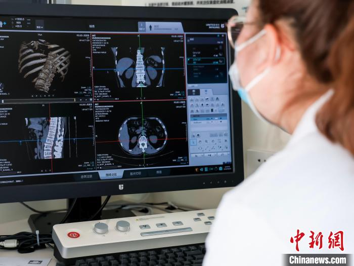 在“移動醫(yī)療一體車”內,26歲的才吉舉著雙手平躺,正等待著胸部CT掃描設備檢測。CT室外,放射科副主任扎西措熟練操作著按鍵,不一會兒,才吉的檢測影像就呈現在了電腦屏幕上。