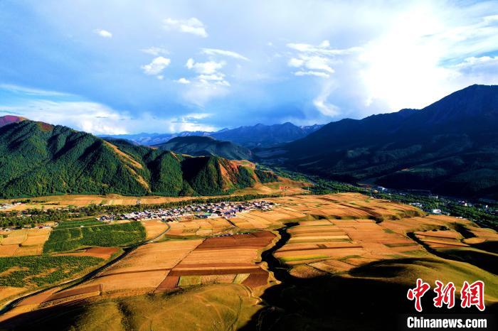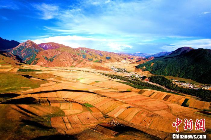 圖為航拍祁連山腹地金色田野。薛蒂 攝