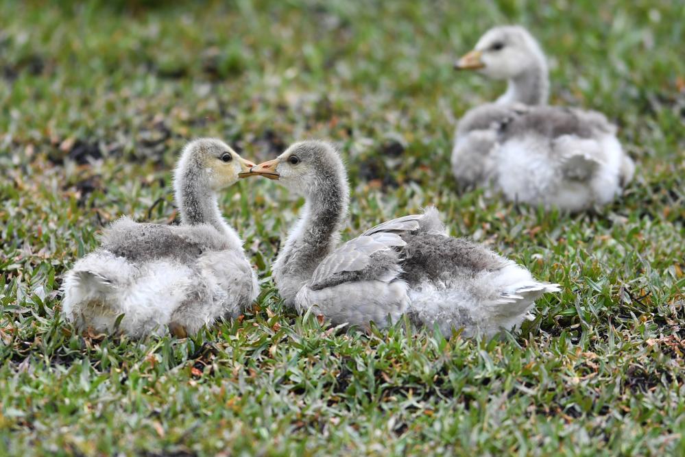 斑頭雁幼鳥在甘肅尕海則岔國家級自然保護(hù)區(qū)的尕海濕地嬉戲。 新華社記者 陳斌 攝