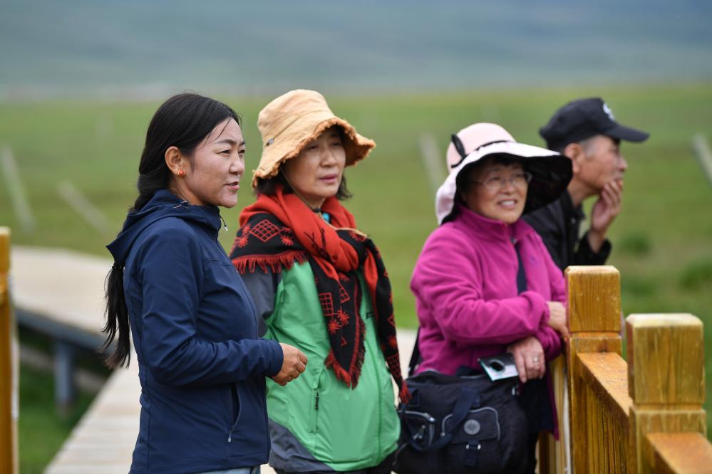 甘肅尕海則岔國家級自然保護(hù)區(qū)管護(hù)中心尕海保護(hù)站站長香毛吉(左一)向游客介紹保護(hù)區(qū)的野生動(dòng)植物情況。 新華社記者 陳斌 攝