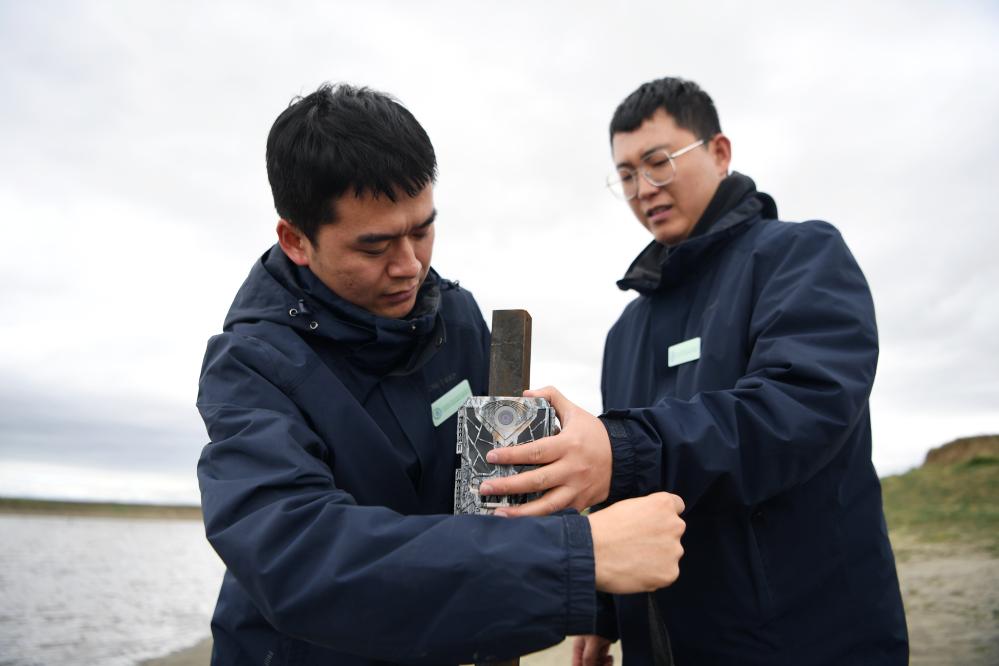 甘肅黃河首曲國家級自然保護(hù)區(qū)管護(hù)中心曼日瑪保護(hù)站的工作人員在保護(hù)區(qū)內(nèi)檢查紅外相機(jī)的工作情況。 新華社記者 方欣 攝