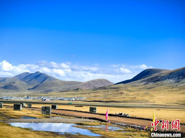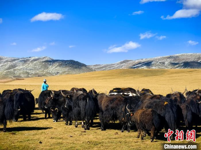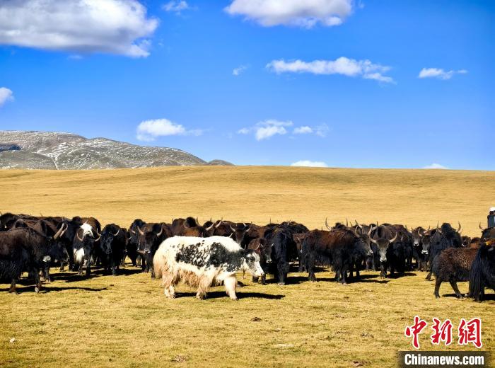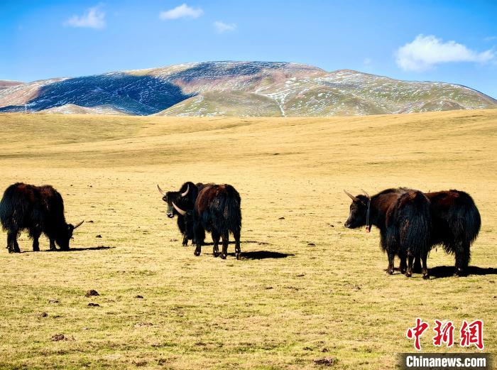 9月20日,青海省玉樹藏族自治州曲麻萊縣生態(tài)牧場牧草已逐漸泛黃。藍天白云下,遼闊的金色草原間,成群的牦牛正悠閑吃草,成為秋日草原一道靚麗風景線。