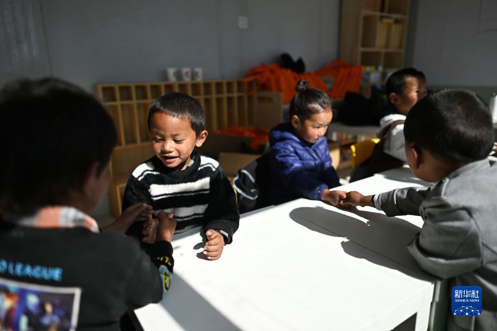 在青海省玉樹藏族自治州曲麻萊縣秋智鄉(xiāng)布甫村陽光幼兒園,普松東周(左二)和伙伴們在教室內(nèi)玩耍(9月14日攝)。新華社記者 韓方方 攝