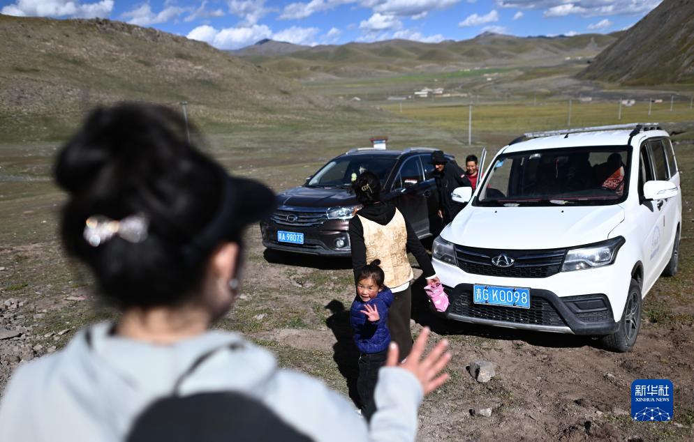 在青海省玉樹藏族自治州曲麻萊縣秋智鄉(xiāng)布甫村陽光幼兒園,老師與學(xué)生家長告別(9月14日攝)。新華社記者 張宏祥 攝