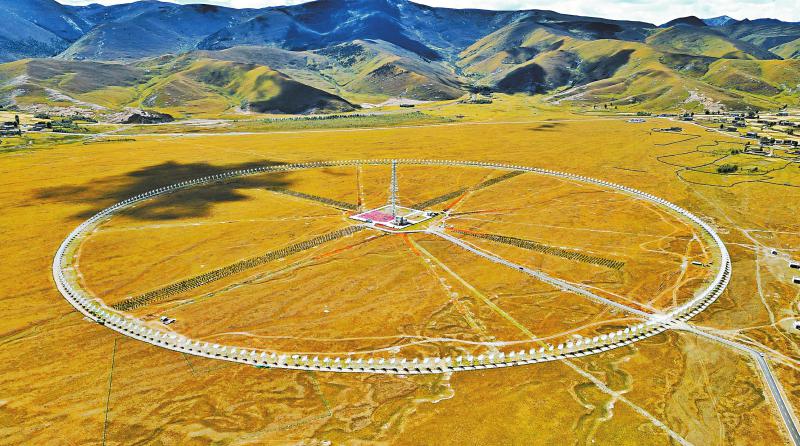 飛機從稻城亞丁機場起飛,右側(cè)舷窗外的地面隱現(xiàn)一個小圓點,因為造型特殊,當(dāng)?shù)厝朔Q“千眼天珠”。小圓點其實一點也不“小”——在海拔3820米的四川省甘孜州稻城縣噶通鎮(zhèn),313部直徑6米的天線,均勻地分布在直徑1公里的圓環(huán)上。它的正式名字叫圓環(huán)陣太陽射電成像望遠鏡(下稱“圓環(huán)陣”),是國家重大科技基礎(chǔ)設(shè)施空間環(huán)境地基綜合監(jiān)測網(wǎng)(子午工程二期)的標(biāo)志性設(shè)備之一,也是目前已建成的全球規(guī)模最大的綜合孔徑射電望遠鏡。其任務(wù)主要是對太陽和日地空間傳播鏈條進行高質(zhì)量監(jiān)測,監(jiān)測太陽“打噴嚏”。