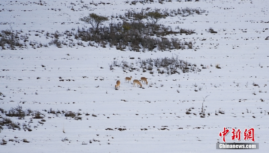 10月12日,四只普氏原羚在青海湖北岸雪中覓食。當(dāng)日,在青海湖北岸的青海省海北藏族自治州剛察縣哈爾蓋“羚羊小鎮(zhèn)”,成群的普氏原羚在雪中覓食、漫步。普氏原羚是世界瀕危物種、國(guó)家一級(jí)重點(diǎn)保護(hù)野生動(dòng)物,現(xiàn)僅分布于青海湖周圍,成為青海湖獨(dú)有的珍稀有蹄類動(dòng)物和旗艦物種。中新社記者 馬銘言 攝
