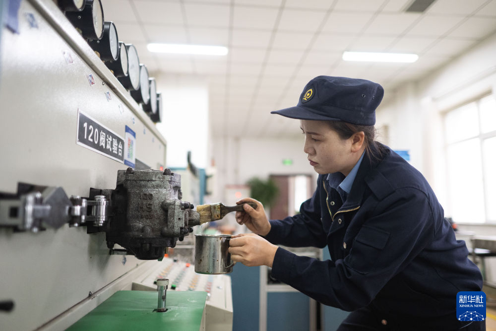 10月12日,在中國鐵路青藏集團(tuán)有限公司西寧東車輛段制動班組,馬婷在研磨120閥滑閥。新華社記者 張龍 攝