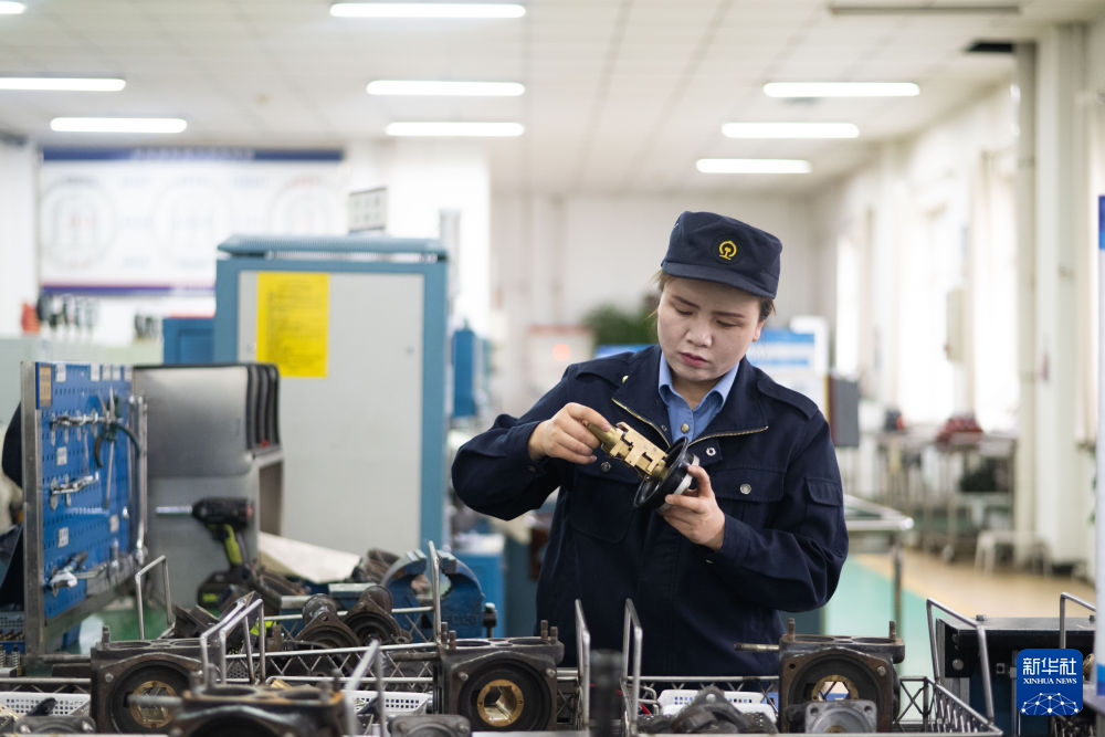 10月12日,在中國鐵路青藏集團(tuán)有限公司西寧東車輛段制動班組,馬婷檢查120閥主閥配件。新華社記者 張龍 攝