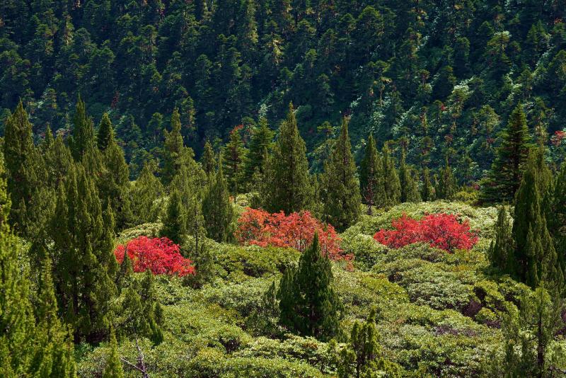 火紅的樹葉如同一叢叢盛開的鮮花點(diǎn)綴在綠樹間