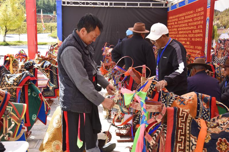 香格里拉市建塘鎮(zhèn)的民間藝人七林定主是鞍馬具制作能手,此次他帶著自己制作的8套鞍馬具來(lái)到交流活動(dòng)現(xiàn)場(chǎng)參展。他說(shuō):“我制作鞍馬具已經(jīng)25年了,希望能通過(guò)這次交流活動(dòng)將香格里拉的鞍馬具文化展示給外地友人?!?/p>