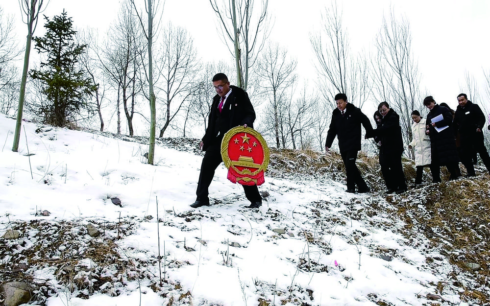 互助土族自治縣人民法院家事審判團(tuán)隊(duì)法官迎著漫天的飛雪,手捧國(guó)徽,入村開(kāi)展巡回審判。省高級(jí)人民法院供圖