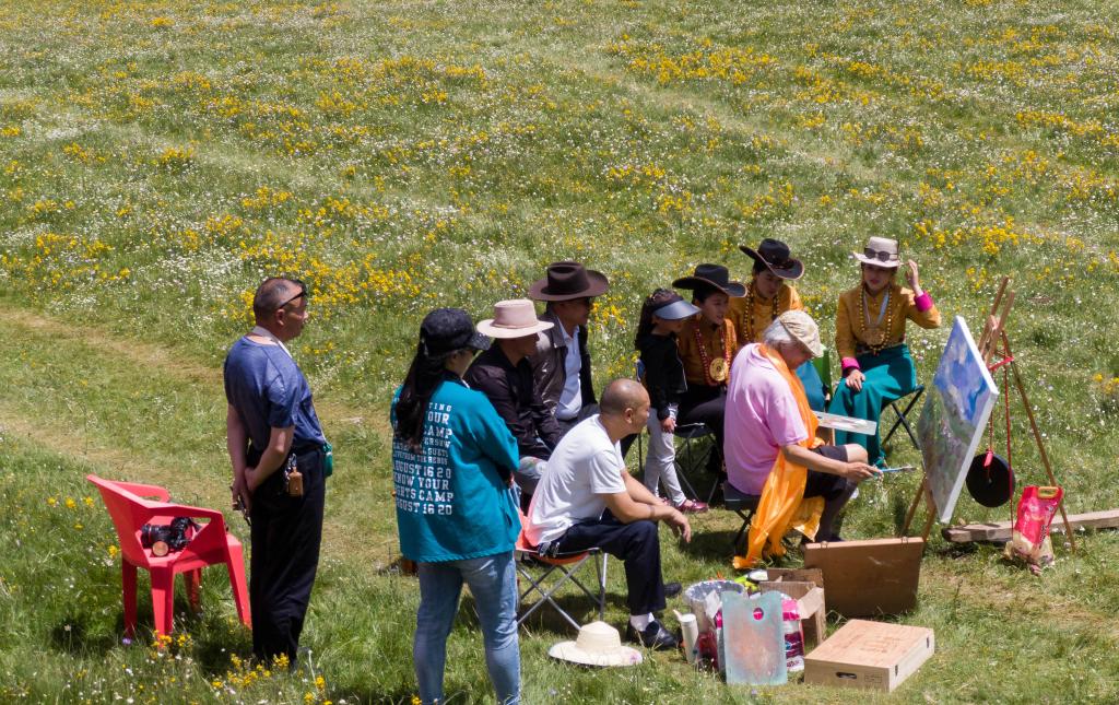2021年7月22日,在道孚縣玉科大草原,一名畫家在花海里創(chuàng)作油畫,吸引了當?shù)啬撩窈陀慰蛧^。新華社記者 江宏景 攝