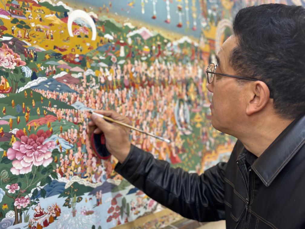 筆在不到1厘米的菩薩臉上劃過,輕得不見著色,幾筆過后,一個由棕漸變到淡黃的下頜線漸漸出現(xiàn)了。這張長約3.5米、高近2米的畫布上分布著2023位人物,最小不及一粒青稞,60歲的非遺傳承人曲久已經畫了3年,還要一年多才能完成。