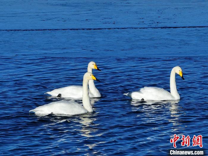 圖為大天鵝在湖中游弋。包雷 攝