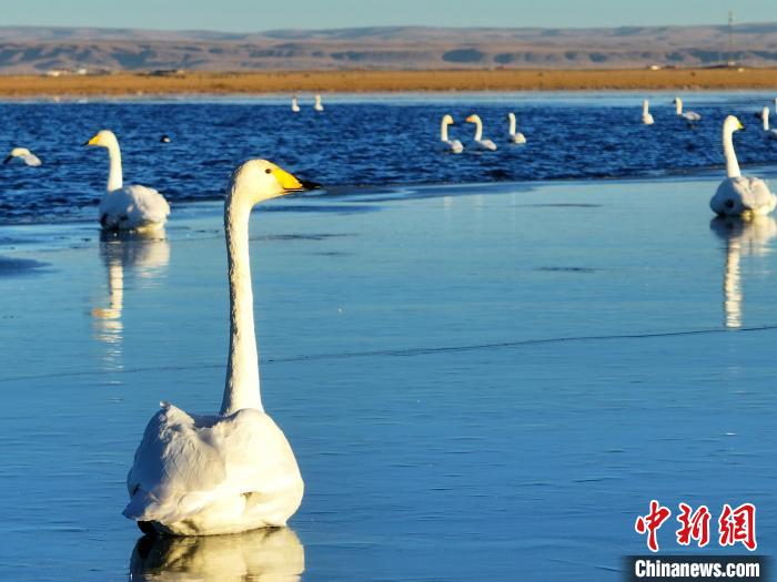 圖為成群大天鵝在青海湖中游弋休憩。包雷 攝