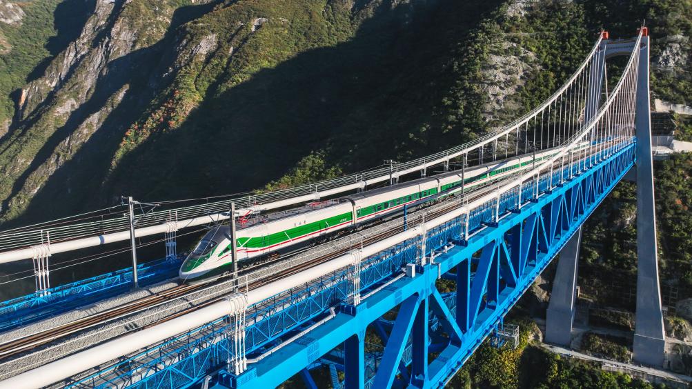 圖為11月9日,麗香鐵路動(dòng)態(tài)檢測(cè)期間,復(fù)興號(hào)列車駛過虎跳峽金沙江鐵路大橋。(中國鐵路昆明局集團(tuán)公司供圖)