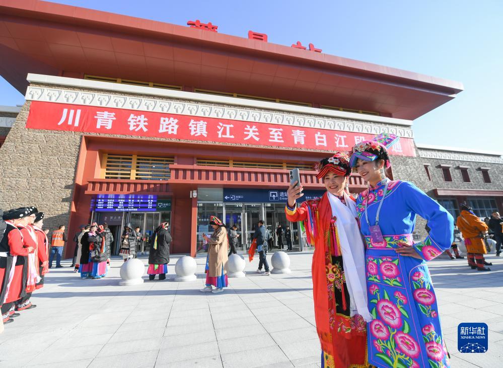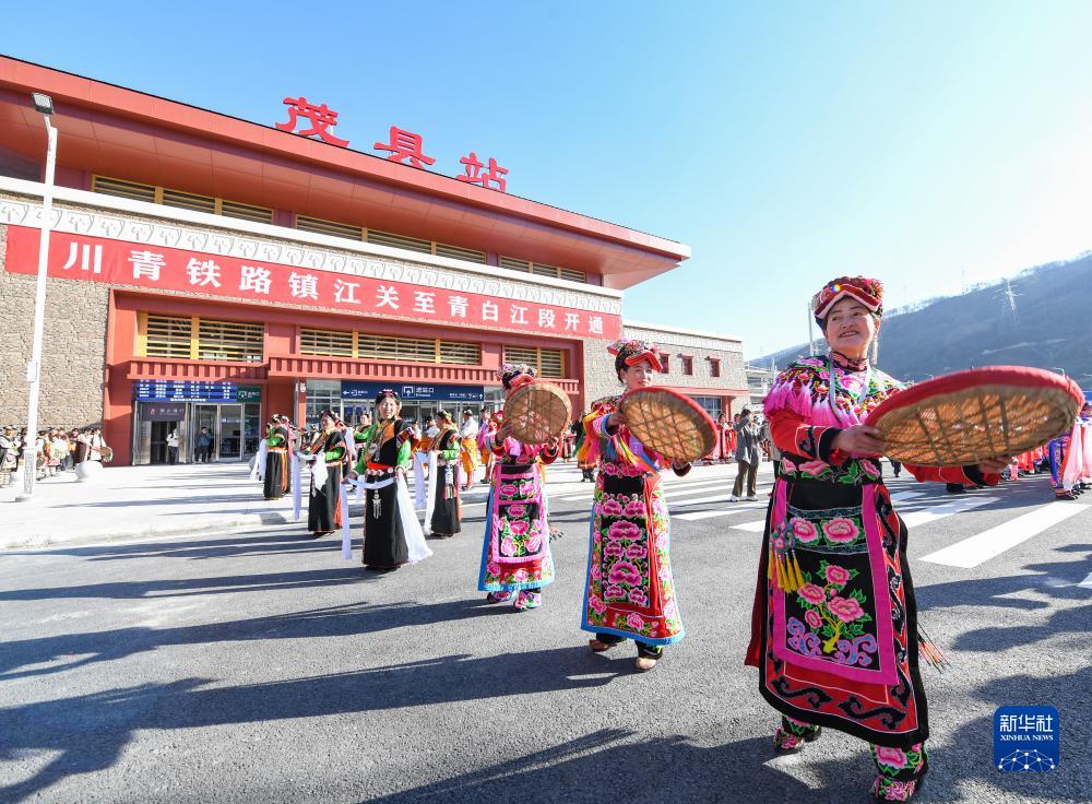 11月28日,在川青鐵路茂縣站,當(dāng)?shù)馗髯迦罕娫谡厩皬V場(chǎng)慶祝鐵路開通運(yùn)營。新華社記者 王曦 攝