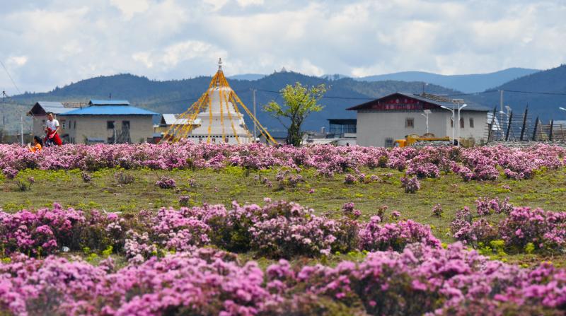 每年5月下旬至6月中旬,小中甸草原就會(huì)被多彩絢爛的杜鵑花、狼毒花以及各種不知名的小花小草包圍,變成一片花的海洋,吸引來(lái)自各地的游客駐足。這時(shí)的小中甸,每個(gè)角度都是美景,花海連著傳統(tǒng)藏族民居,以及遠(yuǎn)處的雪山和森林,恍若走進(jìn)了神話中的仙境,這里也是人們拍寫(xiě)真照、婚紗照的絕好取景地。
