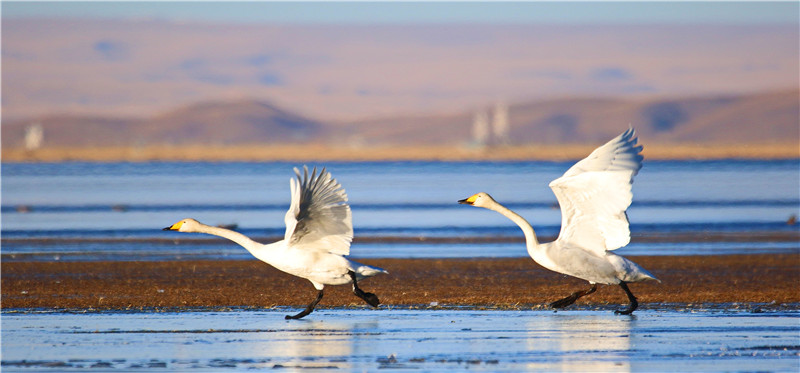冬日的青海湖,一碧千里沒有雜色。湖面像一層薄薄的透明玻璃,晶瑩剔透,湖岸周圍是金黃的草場,遠處是高聳入云的雪峰,潔白的天鵝恰似水中仙子,伸展雙翼,引翅拍水,蕩漾著水波,構(gòu)成一幅冬日美景圖。[詳細] -