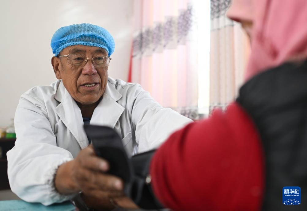 12月22日,完么仁增在牙木村應(yīng)急醫(yī)療點(diǎn)為村民量血壓。新華社記者 張龍 攝