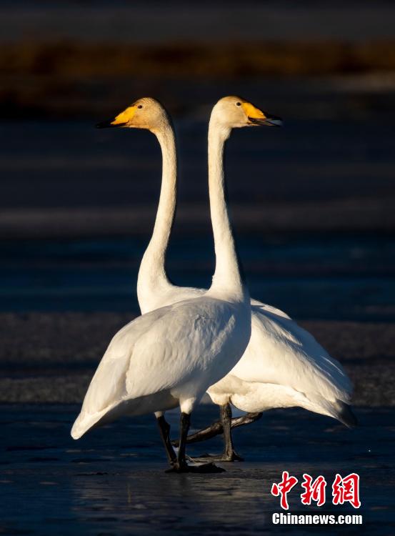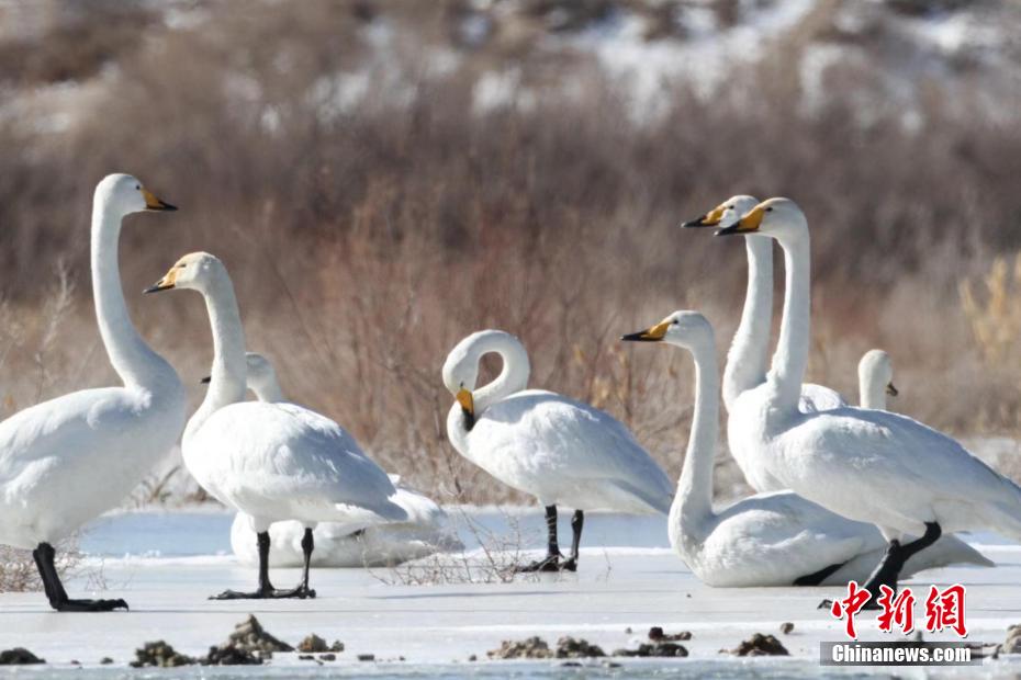 多只天鵝在湖冰上嬉戲。青海可魯克湖-托素湖省級自然保護區(qū) 供圖