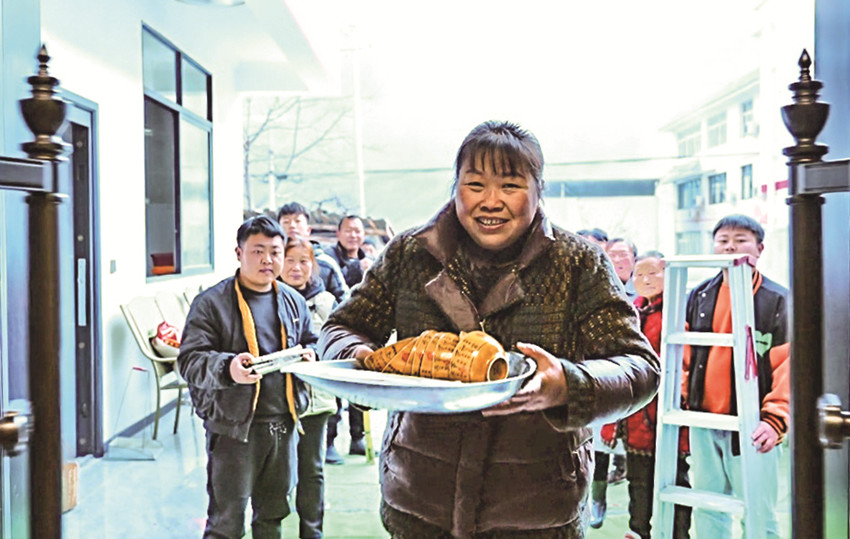 劉有榮端著碗筷進新房。