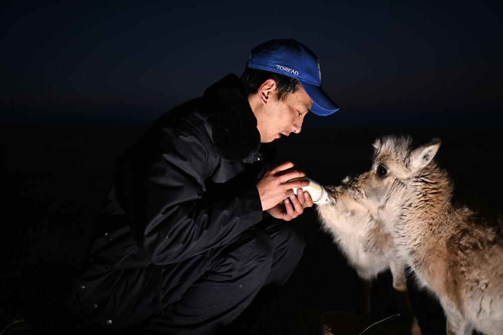 可可西里巡山隊員才文多杰在索南達(dá)杰保護(hù)站內(nèi)給被救助的藏羚羊幼仔喂奶(1月18日攝)。新華社記者 張宏祥 攝