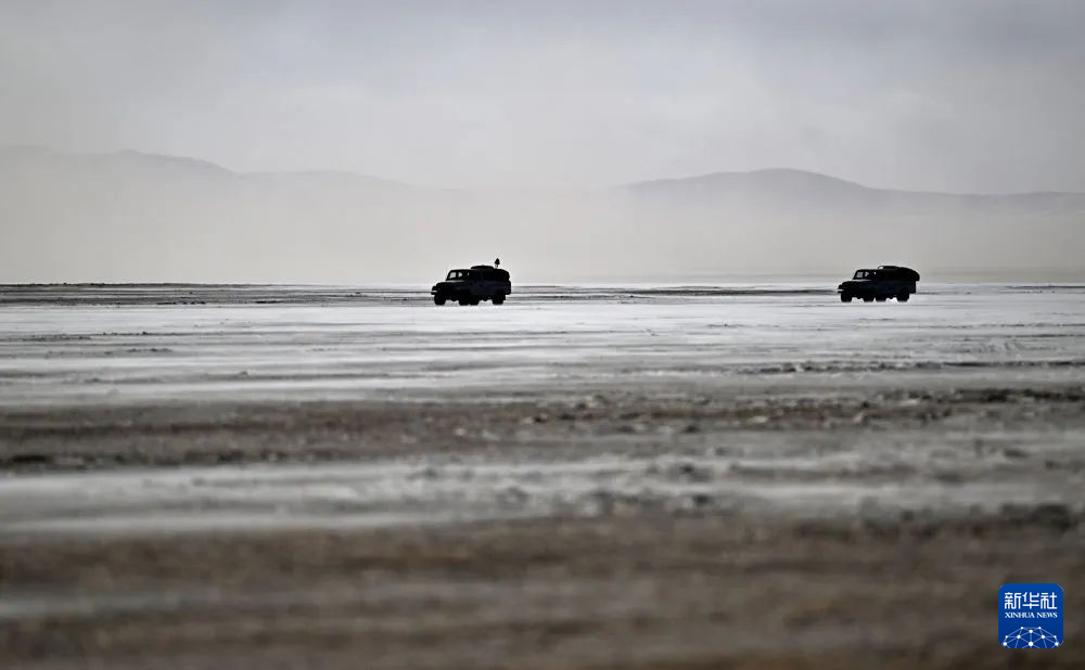 在可可西里卓乃湖區(qū)域附近,可可西里森林公安局巡山車輛在巡查途中(1月19日攝)。新華社記者 張宏祥 攝